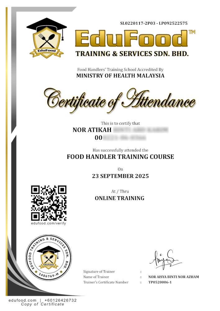 – Scanned Food Handler Training certificate sent immediately via whatsapp (within 12hr after training).